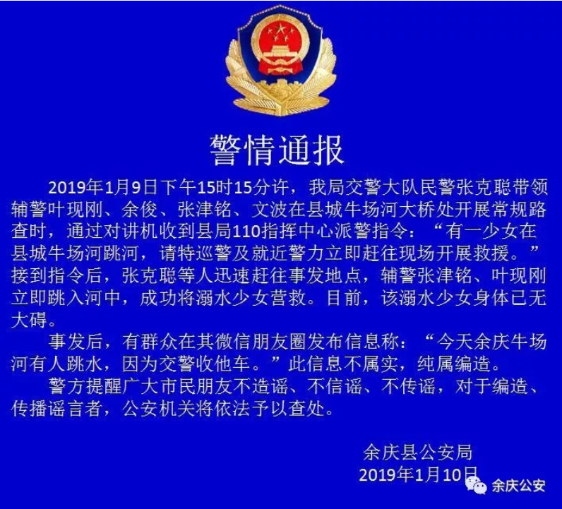 事发后,有群众在微信朋友圈发布信息称:“今天余庆牛场河有人跳水,因为交警收他车。”此信息不属实,纯属编造。