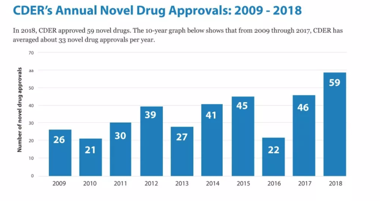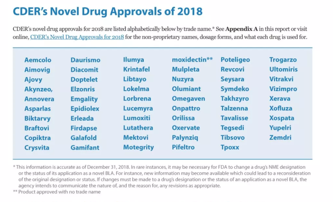 FDA在2108年批准了从未在美国销售过的新型药物、其他增加重要医疗价值的新药,也批准了一些已经获批但增加新适应症和新患者的药物,这些新的批准将使患有各种罕见疾病,神经系统疾病,传染病,癌症和许多其他疾病的患者受益。当然,比数量更重要的是这些药物的医疗价值和它们在改进患者护理方面的重要作用。