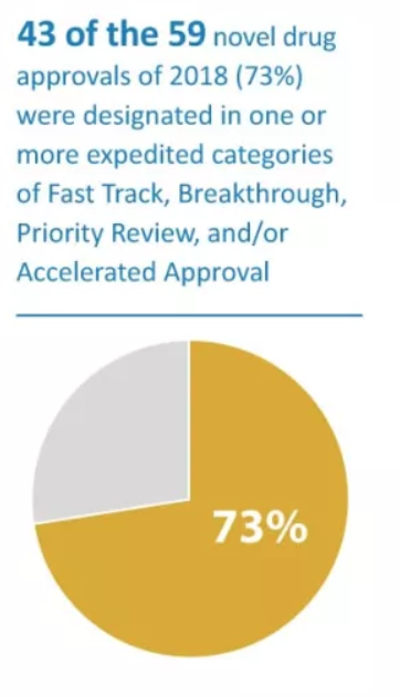 2018年59种新药批准中,43种(73%)被指定为四种审评方式种的一个或多个类别,其中优先审查24种(41%),14种(24%)为突破性疗法,43种(73%)为优先审查,4种(7%)加速批准。