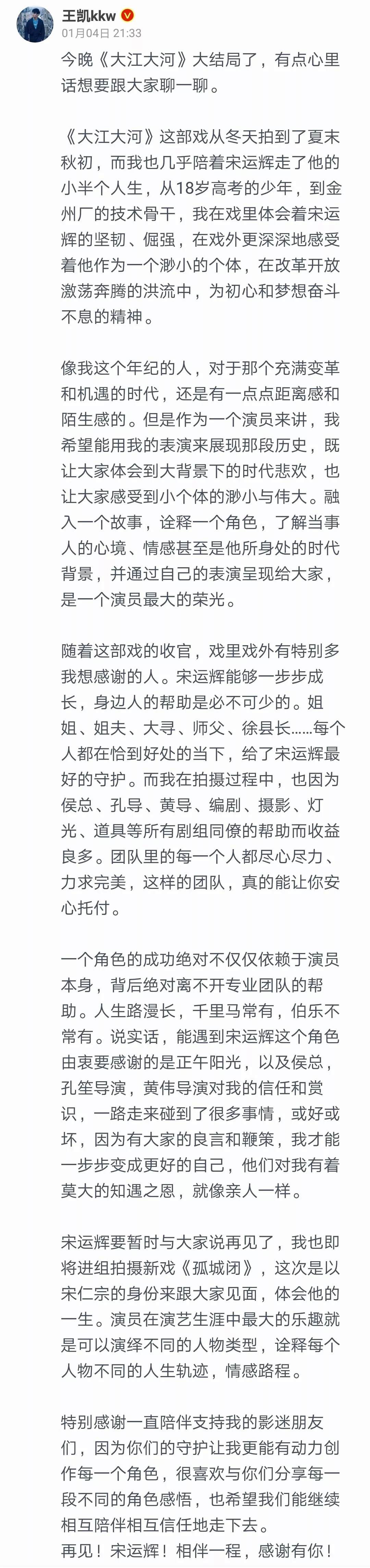 《大江大河》结局的那一天,他特意发了一篇长文,正式与宋运辉告别。