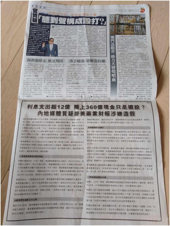 5、在香港《苹果日报》的版面上,曾刊登了一篇文章,标题是《利息支出超12亿,账上360亿现金只是摆设?内地媒体质疑康美药业财报涉嫌造假》。标题看着就触目惊心,内容就更可以想象了。