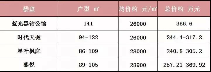 各家大户型比较:熙悦105㎡<星叶枫庭109㎡<时代天樾122㎡<蓝光黑钻公馆141㎡。