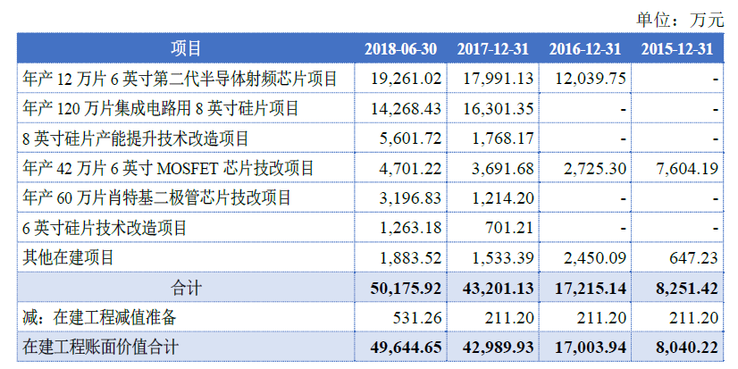 同时公司还在不断加大投入,反映在在建工程增长迅速:2015-2018年上半年,在建工程余额占非流动资产的比例分别为10.52%、19.11%、32.68%和30.74%。其中最大的一项为“年产12万片6英寸第二代半导体射频芯片项目”和“年产120万片集成电路用8英寸硅片项目”,余额分别为1.9亿和1.4亿。