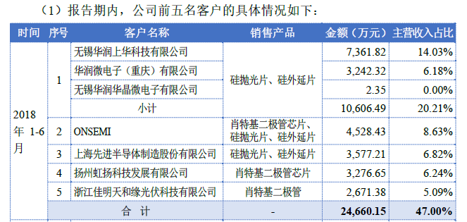 根据招股书,浙江金瑞泓已经成为ONSEMI、AOS、日本东芝公司等知名跨国公司以及中芯国际(0981.HK)、华虹宏力(关联方华虹半导体,1347.HK)、华润上华(0597.HK,已退市)、华润微电子等国内知名企业的供应商。在2015-2018年上半年为例,华润上华一直是公司的第一大客户,贡献营收额超过10%,历史五大客户中还包括了士兰微、扬杰科技等。