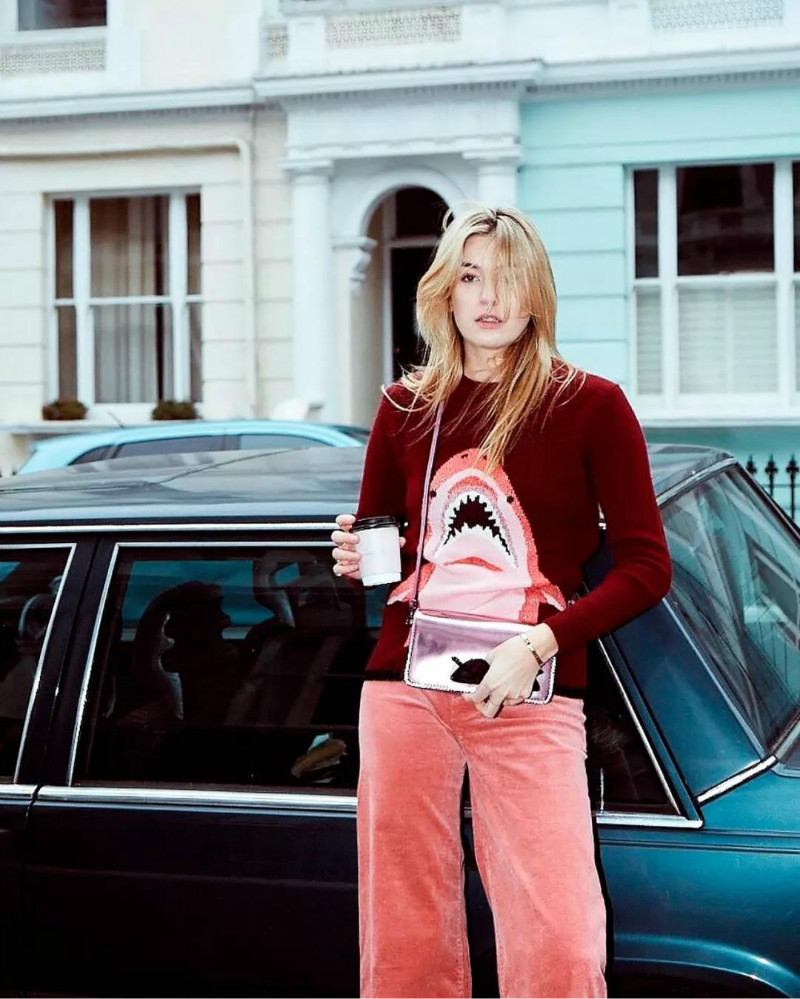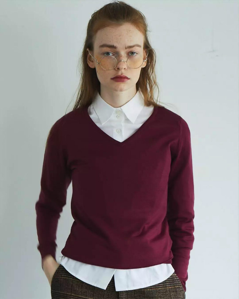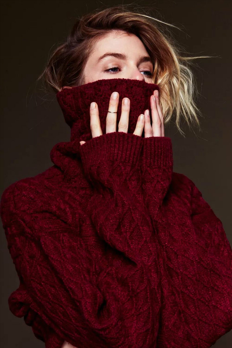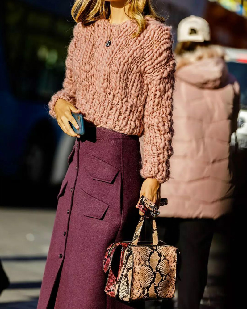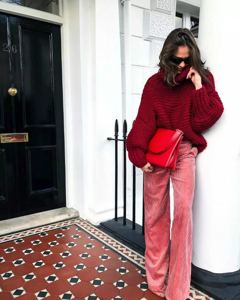 在所有酒红色单品里,酒红色毛衣算是最常见的。试试拿粉色的下装来搭配它,多一份甜美感。▼