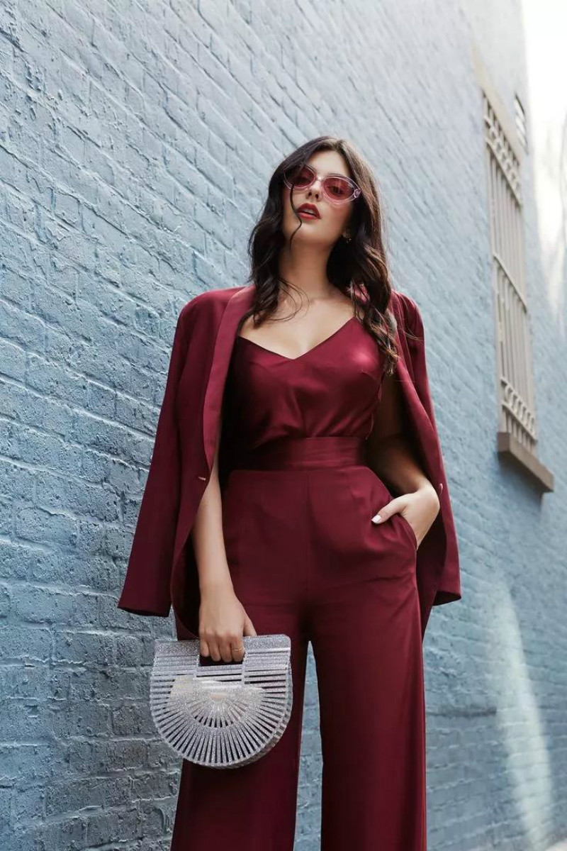 注意啦!这两种颜色不一定要“势均力敌”,采用二八法则,在一身酒红色/粉色里加入一点粉色/酒红色也很特别。