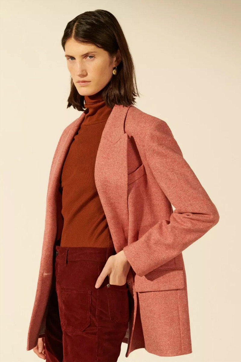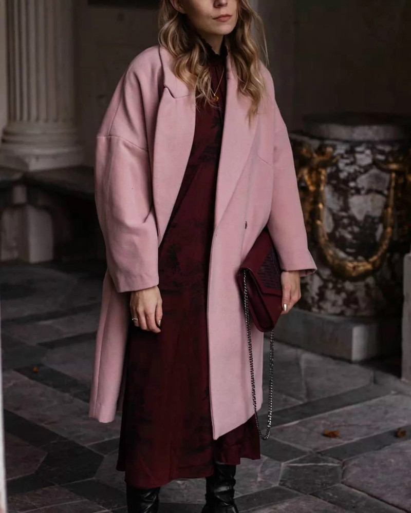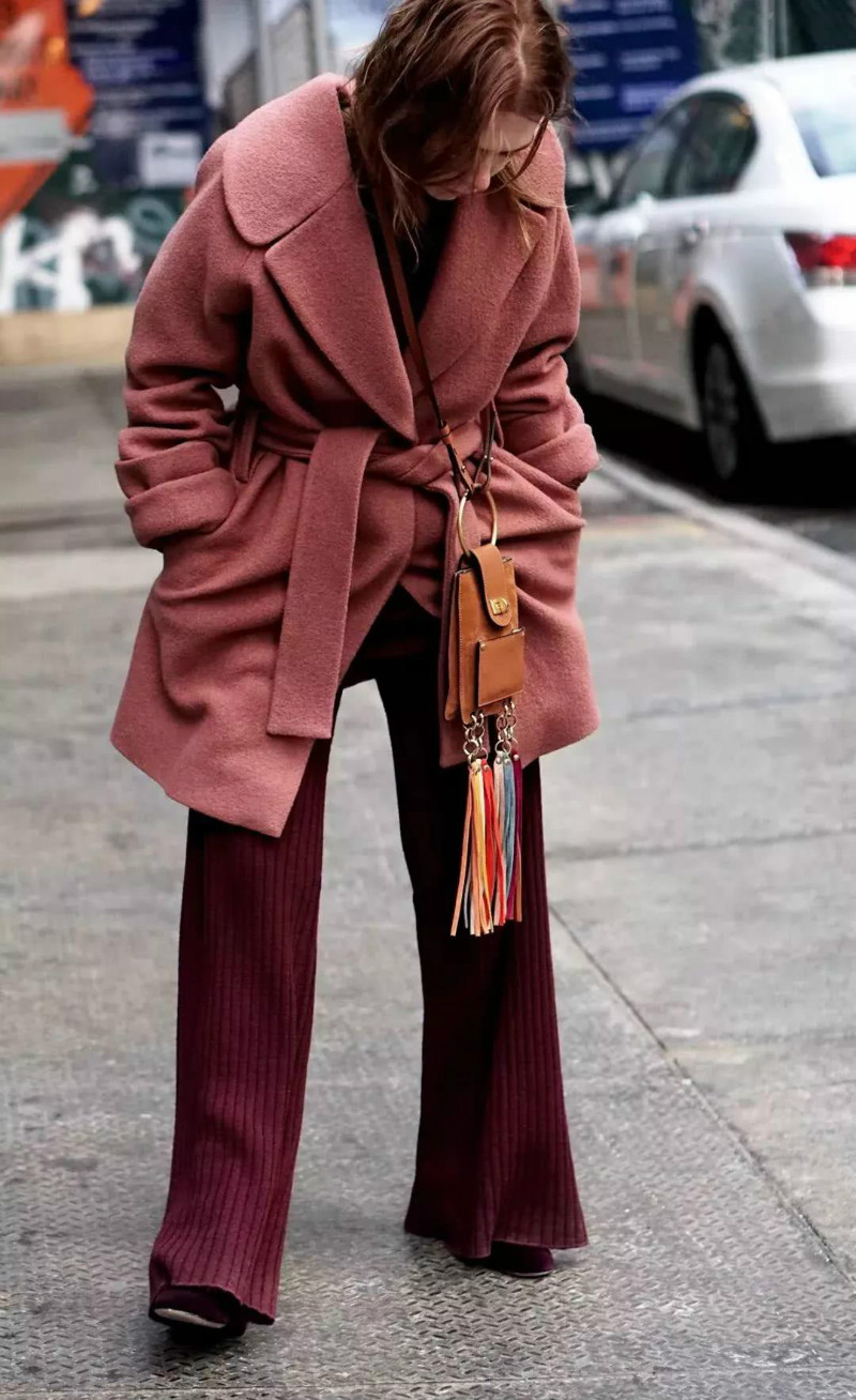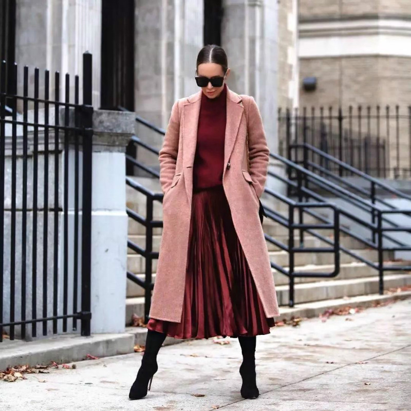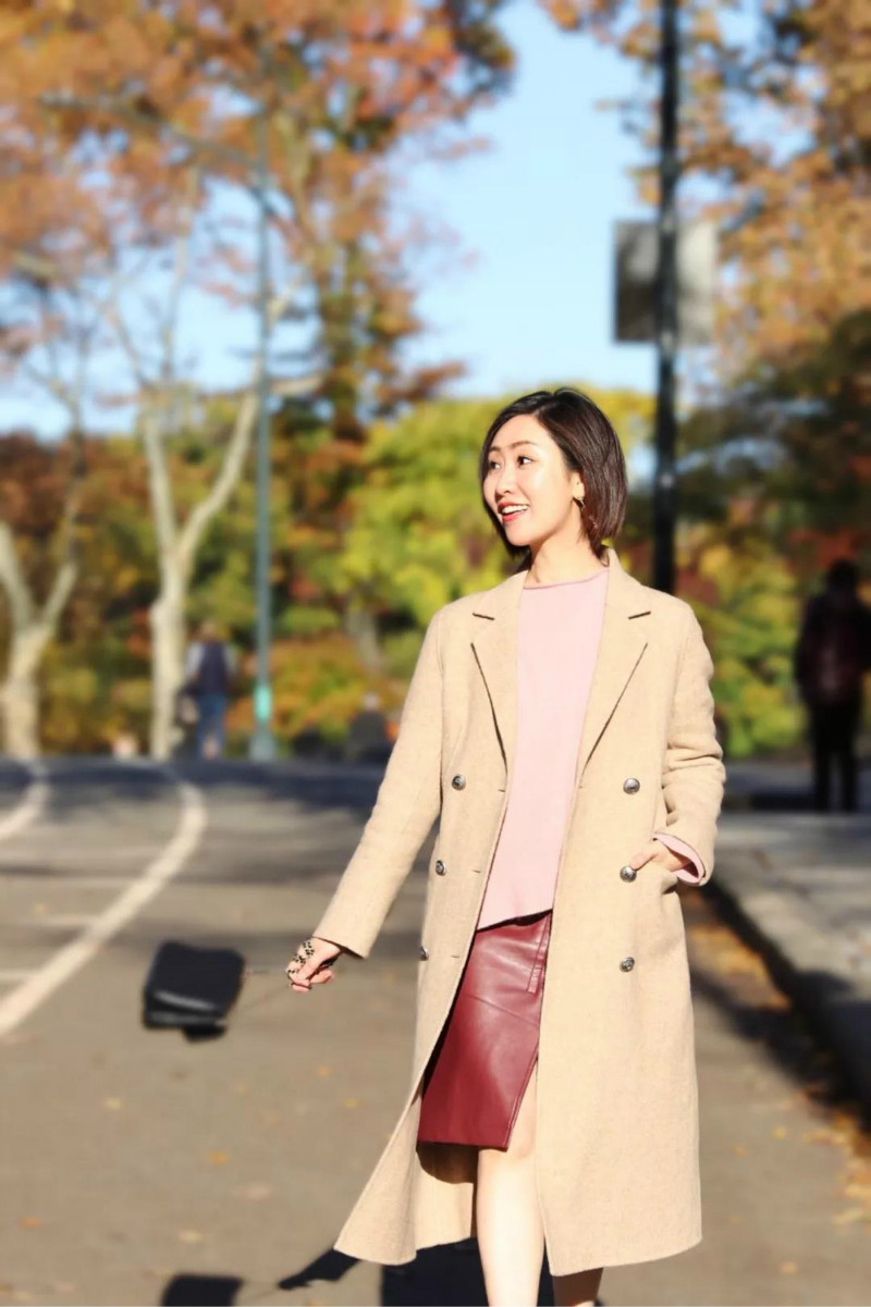粉色大衣我一直都很推荐,和酒红色的毛衣、半裙叠穿和谐又衬肤色。▼