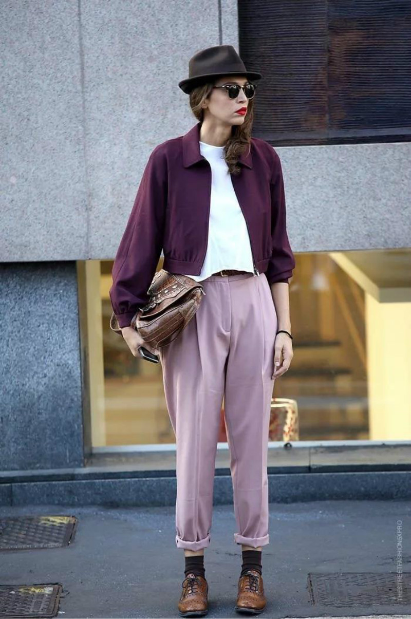 这张图放了N次了,很好看。小礼帽和牛津鞋的加入让她复古又帅气,这种酒红色夹克还蛮少看到的。▼