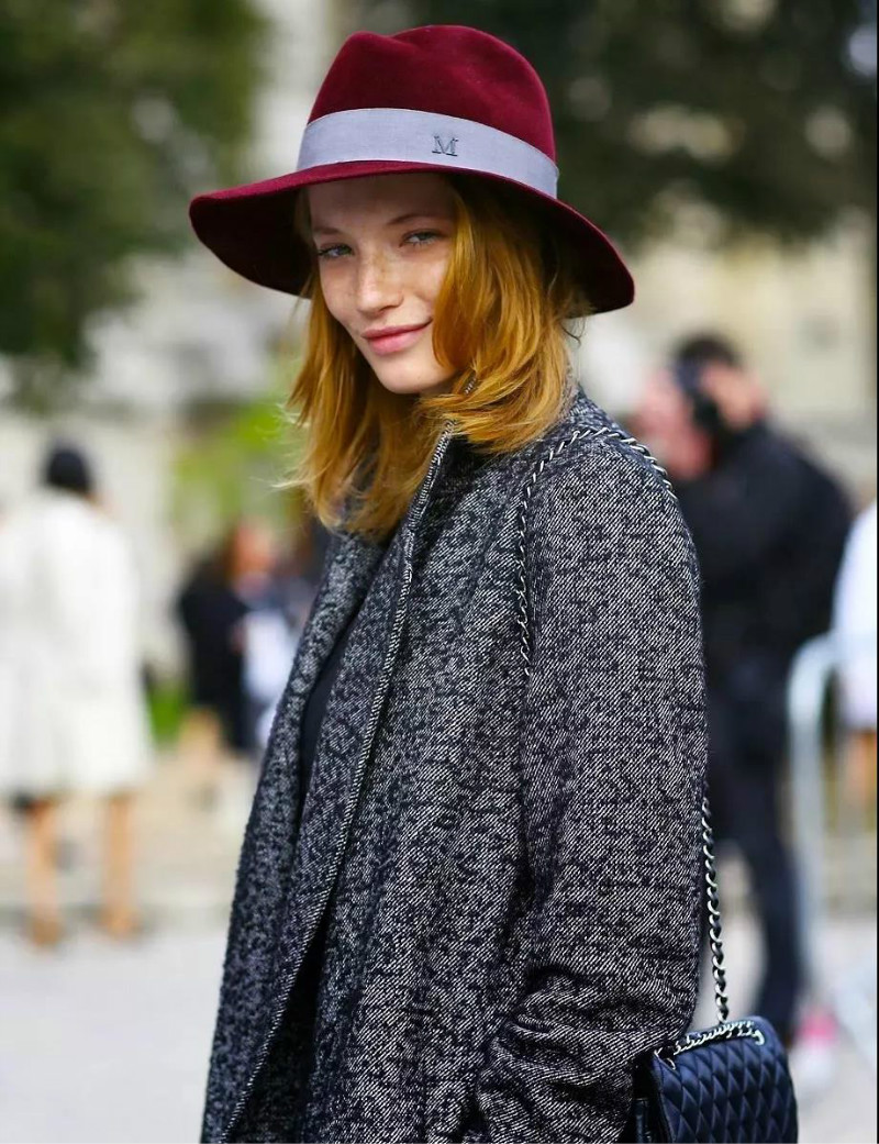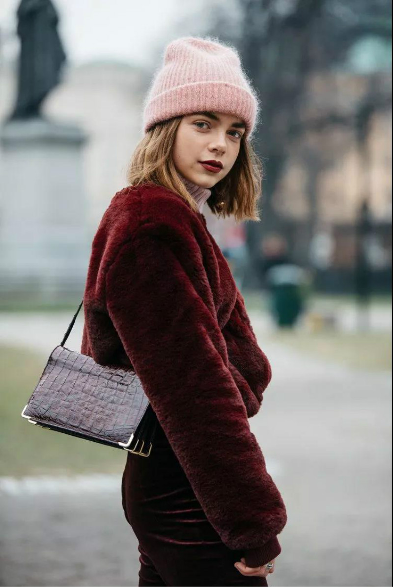 不同的帽子有不同的风格,为它找到衣柜里风格最一致的酒红色单品相搭配吧。贝雷帽配毛毛外套。▼