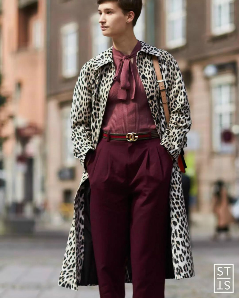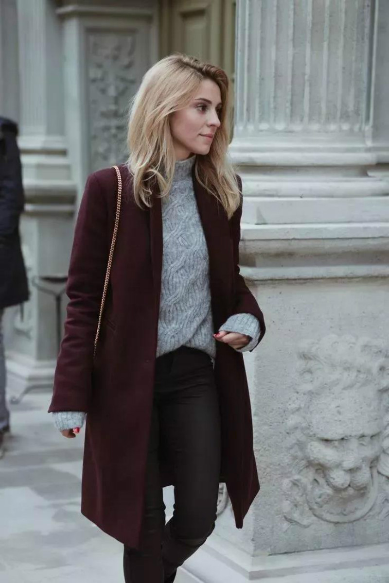 黑白两色配的人很多,我们着重来说说酒红色配灰色吧,也是今天最好模仿的一组,优雅显气质。