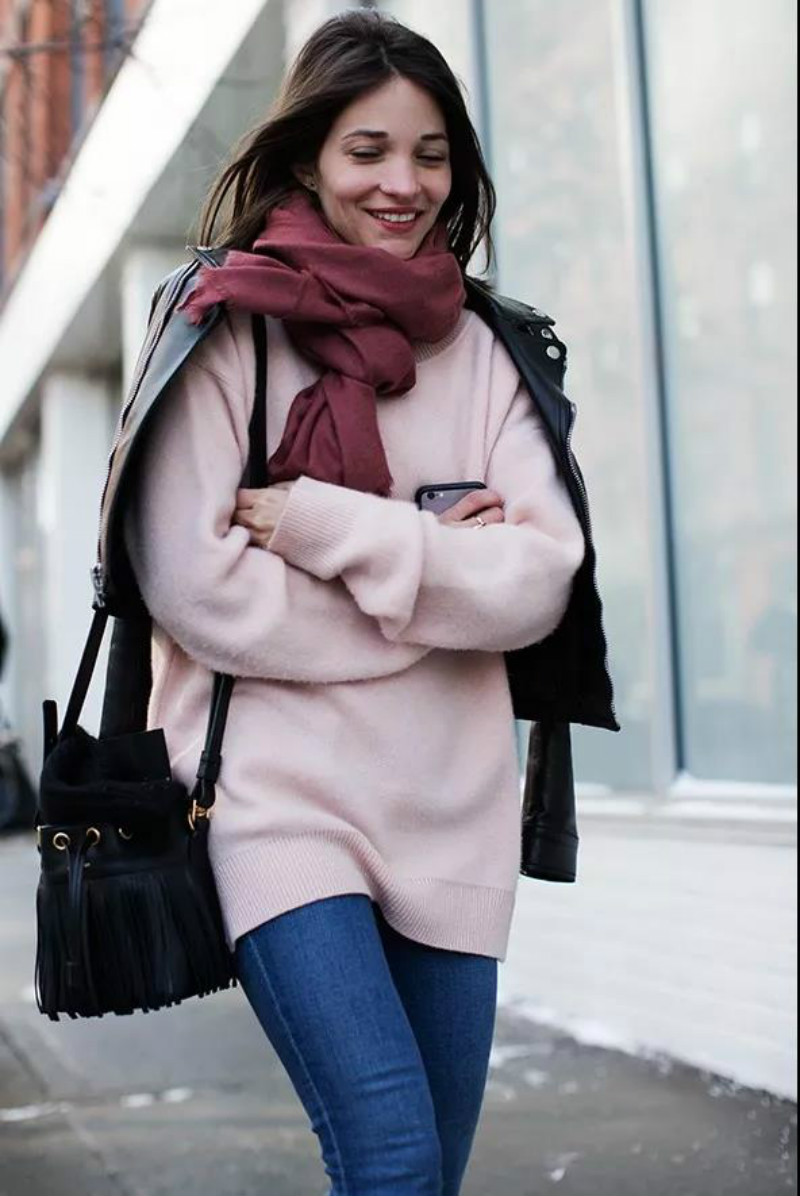 局部搭也出彩,粉色毛衣配酒红色围巾,简单易copy。▼