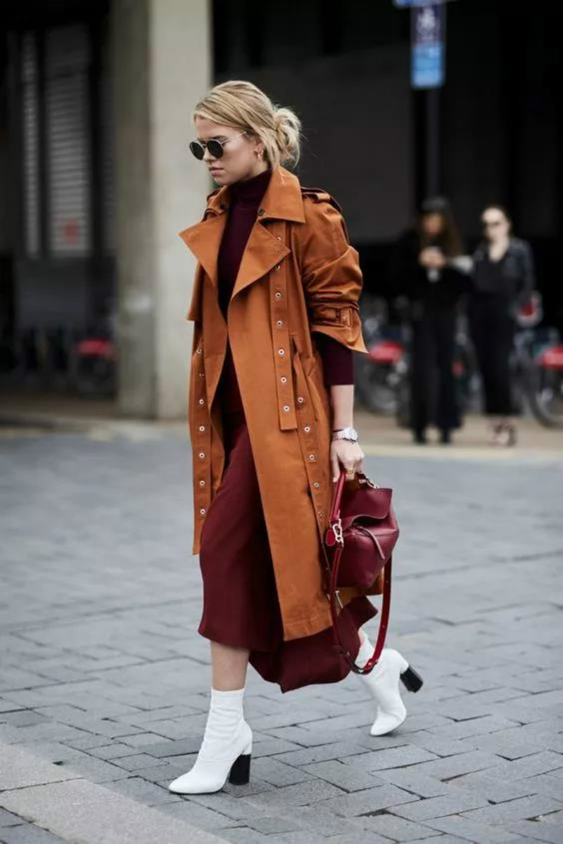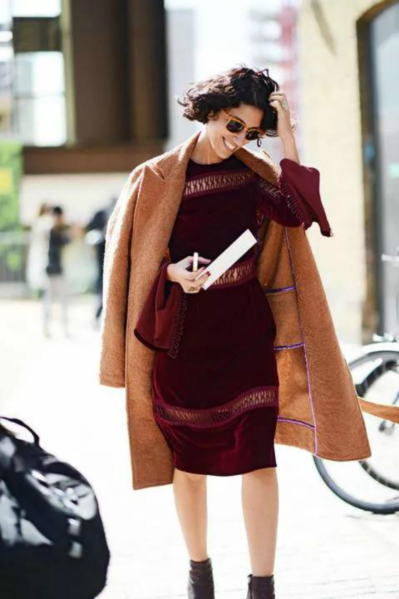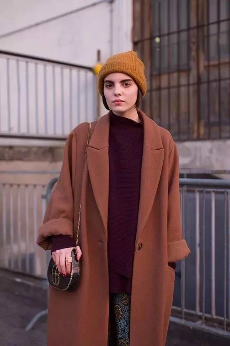 短一点的焦糖色外套也可以这样穿,和酒红色的毛衣配一脸。不用很抢眼,露出一小段的领子已经很时髦了。▼
