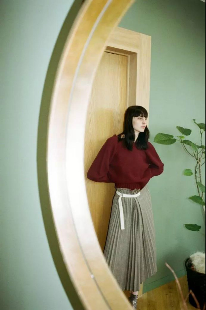 温暖的酒红色毛衣可以搭配灰色半裙来穿。这一身不对称的百褶裙,满满的文艺复古气质。▼