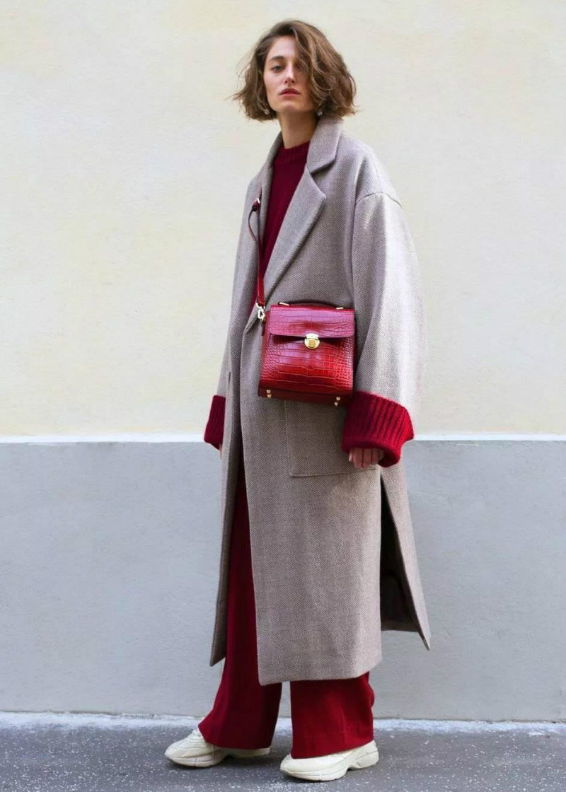 不过,我觉得小面积的酒红色搭配灰色单品更好看!灰色负责优雅气场,酒红色负责提亮点睛。▼