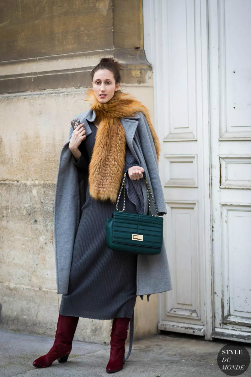 酒红色长靴搭配有难度,灰色配它正好。▼
