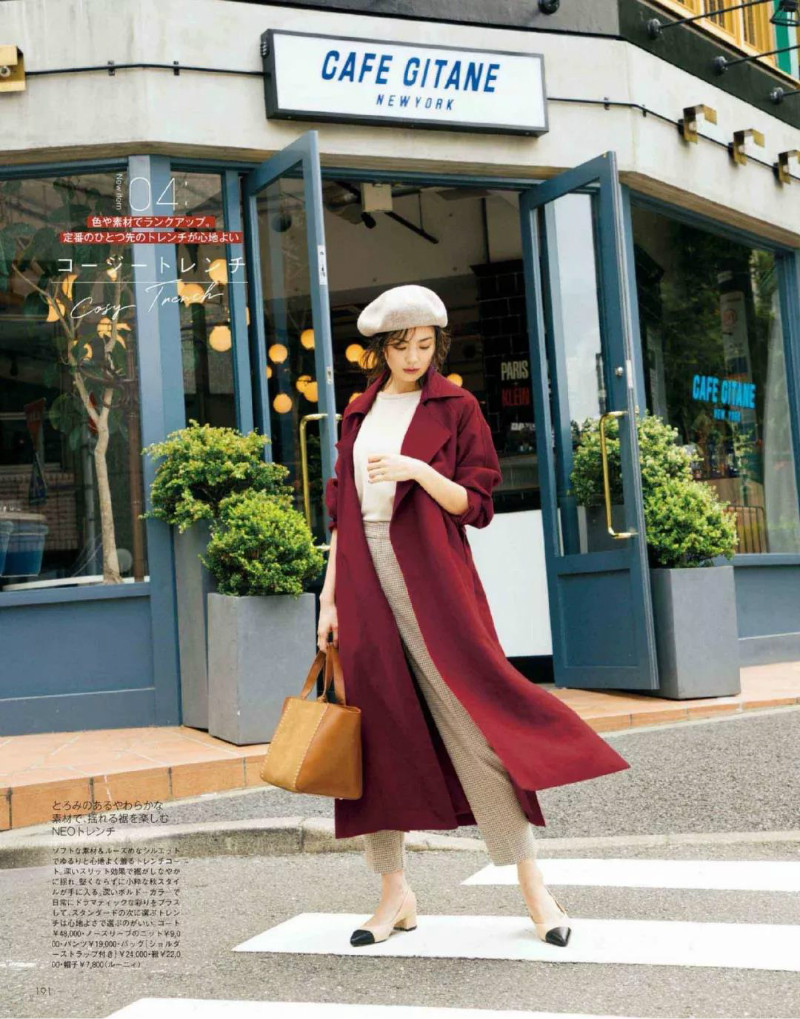 焦糖色大衣很多人都有吧,担心穿它显脸黄的朋友,告诉你们一个“秘诀”。把内搭换上酒红色,不仅显肤白,还能提升气质。▼
