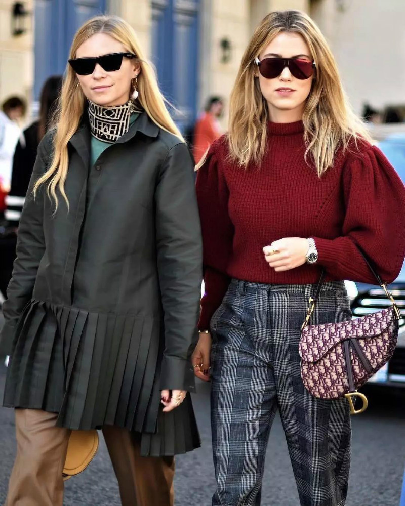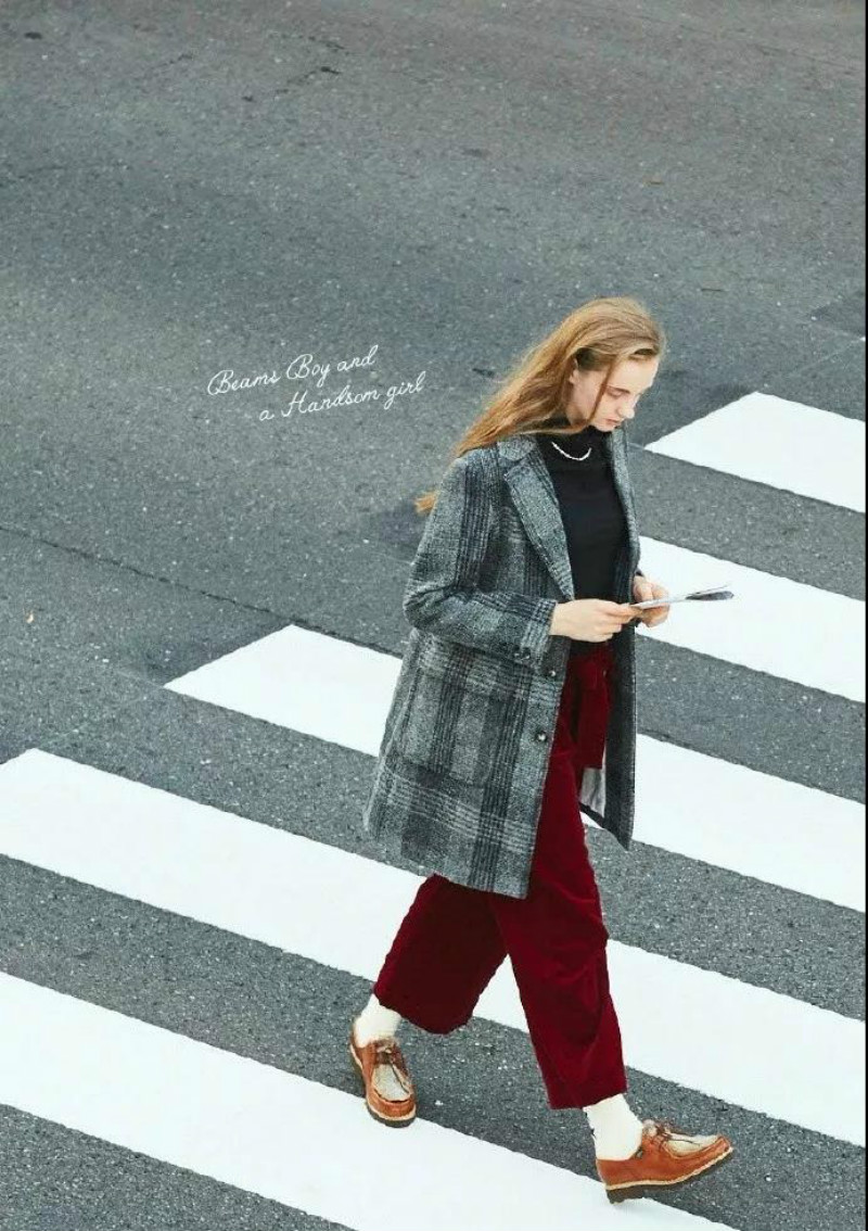 不止是灰色格子,其他颜色的格纹也都可以试试配酒红哦。因为两者同属于复古色系,所以配一起会很和谐。▼