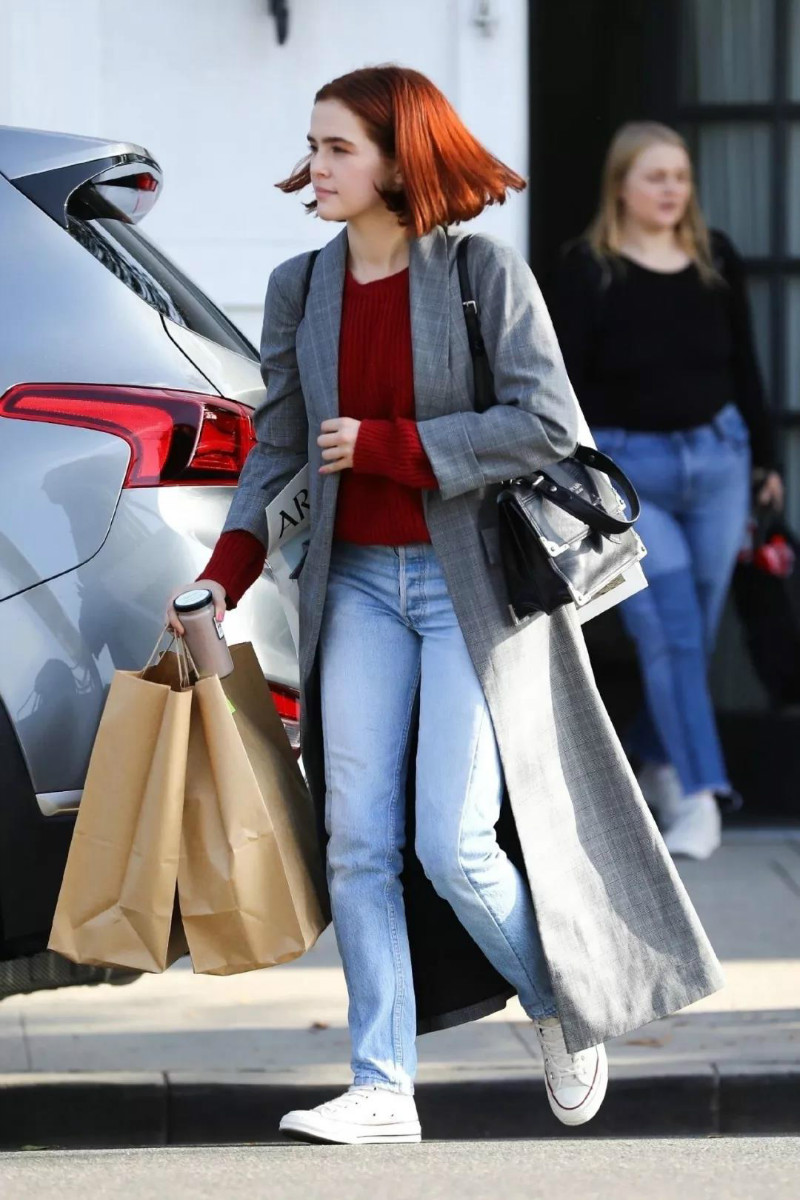 想要温暖一点,可以学学霉霉。最新出街照里面搭了酒红色围巾,裤子也是同款酒红色。▼
