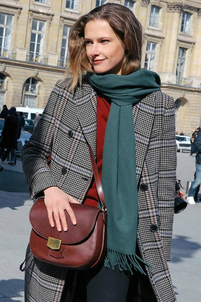 灰色格子西装也是同样的道理,这一身还有焦糖色包包和绿色围巾,颜色超丰富的。▼