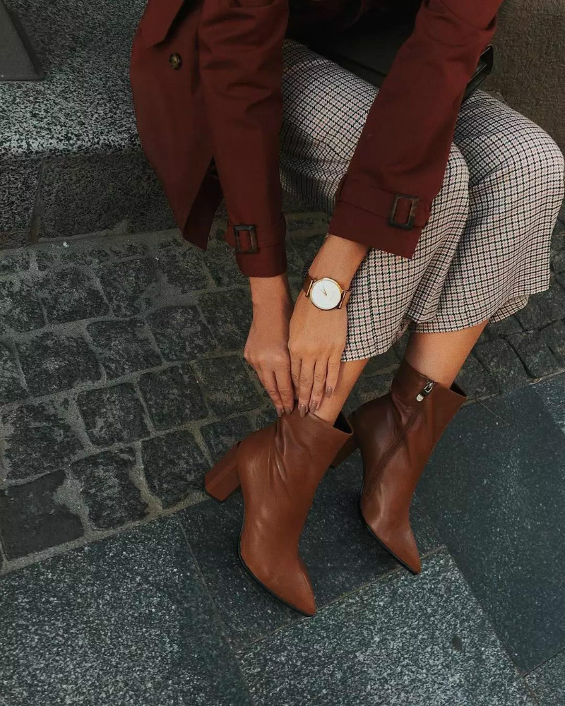 带有白色图案的款式都可以考虑。比如白色格子衬衫,这位的配色好厉害,除了焦糖色,还加入了同色系的褐色,复古感扑面而来。▼