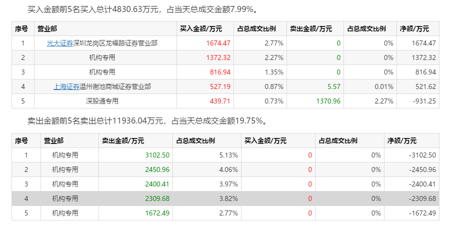 龙虎榜显示,买入金额前5名买入总计4830.63万元,占当天总成交金额7.99%,其中有三个机构席位;卖出金额前5名卖出总计11936.04万元,占当天总成交金额19.75%,均为机构席位。