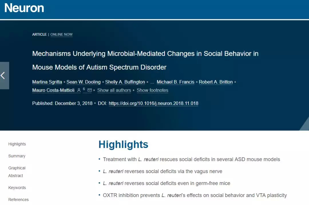 2016年,柯斯塔-马提欧利博士和他的团队首次发表了罗伊氏乳杆菌对自闭症的影响,他们在肥胖的雌性老鼠身上进行了实验。