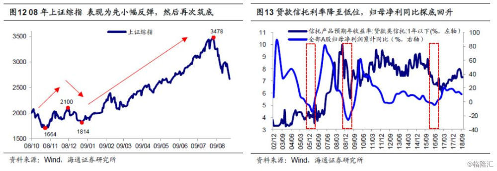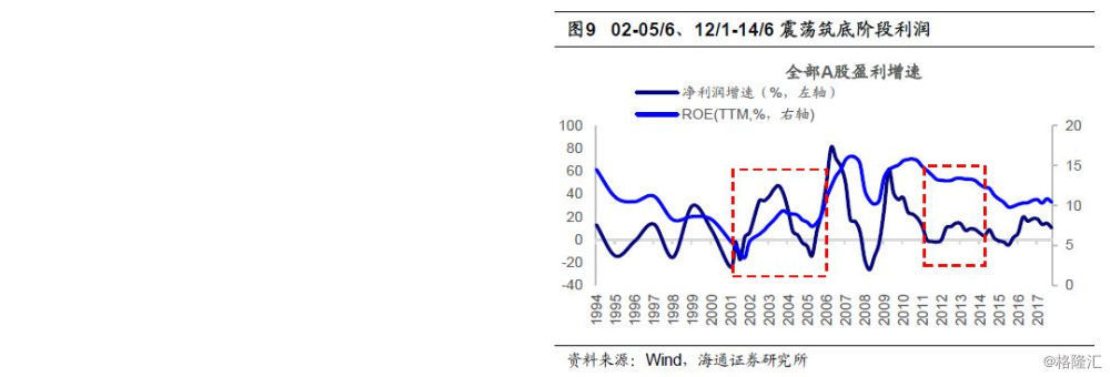 A股常见“尖顶圆底”。回顾5轮牛中周期的顶部和底部,往往是“尖顶圆底”。上证综指在见顶之后的熊市下跌往往时间短、跌幅深,五轮牛熊周期中熊市平均约10月,跌幅在30%-79%之间。而市场在底部阶段,除08年以外都经历了长期的磨底过程,如94/7-96/1的震荡筑底阶段持续了15个月,02/1-05/6持续了40个月,12/1-14/6持续了31个月,16/1至今的震荡筑底阶段也持续了35个月。回顾2000年以来998点、1664点、1849点三次熊市筑底的背景:第一次,在02/1-05/6震荡筑底阶段。在经历了01/6-02/1从2245点-1330点的两轮下跌后,市场进入了2年多1300点-1780点的横盘震荡期。03-04年宏微观基本面均好转,港股开启牛市,但04年之后经济出现过热苗头,这导致04后的宏观调控政策趋紧,04/10央行加息,经济增速再次回落,市场开始破位下跌。2005年4月29日证监会在宣布启动股权分置改革的试点工作,这引发了市场恐慌,上证综指最终跌至998点。直到2005/6/6之后监管层频繁推出利好政策,加上宏微观基本面逐步好转,市场逐步进入波浪壮阔的大牛市,从998点一路上涨到6124点。第二次,08年1664点的熊市背景是:07年经济繁荣,通胀上升,导致07年3月后央行持续加息收紧货币政策,紧缩政策不断累积后07年10月16日6124点开始见顶下跌。2008年上半年国内货币政策继续收紧,08年三季度叠加全球金融危机冲击,宏观经济与企业盈利都快速下滑,08年全部A股净利润增速从07年的49%降至08年的-17%,ROE(TTM)从15.7%回落至11.9%,最终指数跌至1664点。之后四万亿投资、十万亿信贷为代表的大规模刺激需求政策推动经济见底回升,股市迎来了V型反转的牛市,从1664点一路上涨至3478点。第三次,12/1-14/6的磨底阶段,宏观经济缓慢下行,GDP增速由2012年的8.1%降至2014Q2的7.5%。这轮磨底阶段最低点出现在2013年6月25日,源于“钱荒”事件,上证综指最低1849点。之后在2000点附近磨底1年,14年7月开始缓慢上涨,11月央行在正式下调贷款基准利率后货币政策转向宽松,市场迎来一轮流动性驱动的牛市,类似1996-2001年。