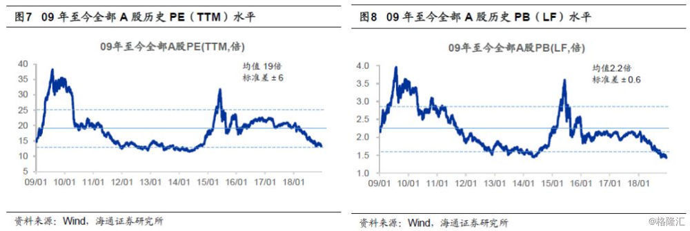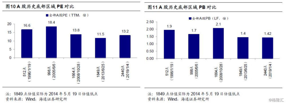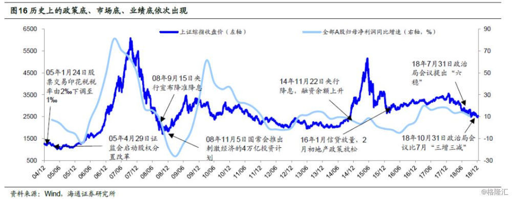 16年1月来震荡大底类似02-05年,目前类似05年上半年,也类似08年4季度。目前A股估值已经处于历史底部,对比过去几次市场底部,1996年1月19日上证综指512点、2005年6月6日998点、2008年10月28日1664点、2013年6月25日1849点,前四次市场底部全部A股PE(TTM,整体法,下同)为11.5-18.4倍,PB(LF,整体法,下同)为1.48-2.06倍,前期低点上证综指2440点(2019/1/4)则分别为13.2倍、1.42倍,已经处于底部区域下轨附近。长一点视角看,2016年1月底2638点以来,市场再次进入反复筑底阶段,这轮市场筑底特征更像2002-05年,都是基本面呈W型波动,股市需待基本面底部夯实,所以指数形态上都有点W型特征。2016-17年类似2003-04年,2018年以来类似2004年2季度后,盈利二次探底的过程中,市场开始构筑W型右侧底。短一点视角看,目前类似05年上半年,也类似08年4季度。我们在前期报告《借鉴历史:政策底》市场底》业绩底-20181028》中曾分析过,历史大底都很复杂,政策底领先市场底领先业绩底。回顾02/1-05/6市场大震荡筑底的最后阶段,先出现政策底,即2005年1月财政部决定将证券交易印花税税率由2‰调整为1‰,上证综指从1200点反弹至1300点,但2005年4月29日证监会启动股权分置改革,随后市场底出现,6月6日上证综指触底998点,业绩底则在06Q1出现,全部A股归母净利润累计同比从06Q1低点-14.0%。回顾08年1664点筑底过程,10月28日上证综指1664点是政策底,当时的背景是08年9月15日央行宣布降息降准,11月5日国务院常委会议推出刺激经济的四万亿投资计划。但是指数反弹到2100点之后再次回落到1814点,即市场底,主要原因是这一时期虽然政策拐点出现,但是政策效果尚未显现,基本面依旧向下。最终业绩底是2009年4月。这一次政策底已经出现,即上证综指2449点,背景是7月31日中央政治局会议提出“六稳”,政策开始微调,10月31日中央政治局会相比7月底新增三个内容,即“经济下行压力有所加大”、“支持民营经济发展”、“促进金融市场健康发展”。但市场仍需反复筑底,政策拐点出现,但是企业盈利恶化的趋势不变,市场处于政策上盈利下的交织期。接下来一段时间A股面临的宏观背景是,政策力度不够、政策效果还未体现,不足以抵挡基本面下滑的趋势,即《穿越黑暗迎黎明——2019年A股投资策略-20181209》中提出的“黑暗期”。