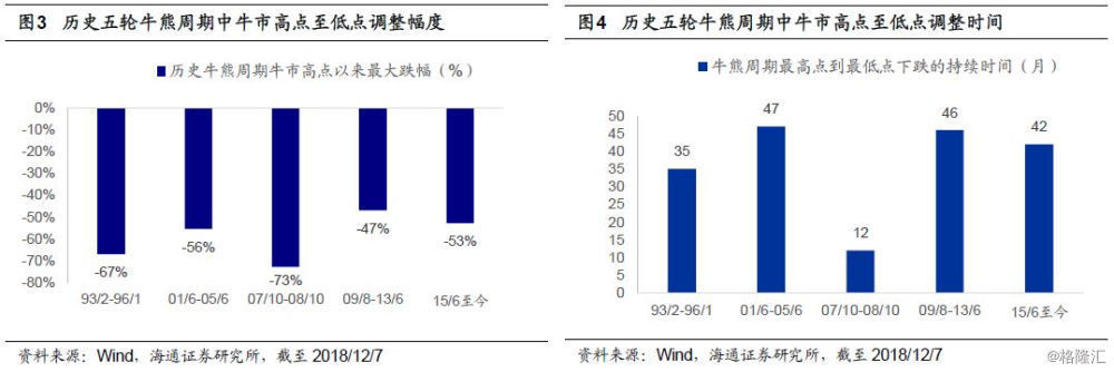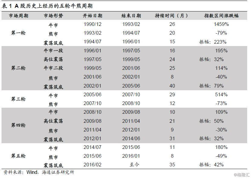 A股有史以来经历了五轮牛熊周期。我们一直把市场分为三种状态:单边上涨定义为牛市,单边下跌定义为熊市,区间波动定义为震荡市,牛市不仅指数上涨还伴随着增量资金入场,熊市不仅指数下跌还伴随着资金流出,震荡市整体上指数区间波动、存量资金博弈。从1990年上海证券交易所成立以来,A股已经经历了五轮“牛市-熊市-震荡市”周期不断交替的过程。第一轮牛市是1990/12-1993/2,93/2-94/7进入熊市,随后在94/7-96/1震荡筑底。第二轮牛市是1996/1-2001/6(中间包含了97/5-99/5持续24个月的高位震荡),01/6-02/1是熊市,02/1-05/6震荡筑底,其中04/11-05/6市场经历了震荡筑底的尾部最后一跌。第三轮牛市是2005/6-2007/10,随后07/10-08/10进入熊市,这次市场大幅下跌之后没有经历底部震荡,而是直接从08年10月28日开始快速上涨。第四轮牛市是2008/10-2009/8,随后在09/8-11/4期间市场高位震荡,11/4-12/1期间市场进入熊市,之后12/1-14/6期间市场震荡筑底。第五轮牛市是2014/7-2015/6,经历了15/6-16/1期间的三轮大跌之后,从16/1的上证综指2638点至今市场处于震荡筑底阶段。回顾前四次市场从牛市最高点以来调整阶段的市场表现,第一轮是1993/2/16-1996/1/19,上证综指跌幅67%,持续35个月;第二轮是2001/6/14-2005/6/6,跌幅56%,持续了47个月;第三轮是2007/10/16-2008/10/18,跌幅73%,持续了12个月;第四轮是2009/8/4-2013/6/26,跌幅47%,持续了46个月。从2016年1月底上证综指2638点以来,市场再次进入中长期圆弧底阶段,这轮调整从15/6/12高点5178点以来至今最大跌幅53%,截至目前已持续约42个月,指数跌幅与持续时间都已经与前4轮调整阶段相近,市场已经处于第五轮周期的底部区域,详见报告《穿越黑暗迎黎明——2019年A股投资策略-20181209》。