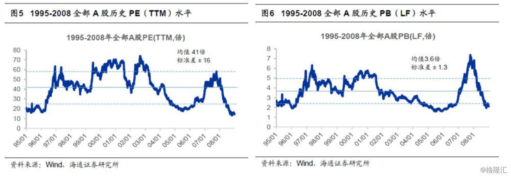 顶部尖源于估值奇高、估值盈利不匹配,所谓病来如山倒。俗话说“病来如山倒,病走如抽丝”,A股的表现也同样类似。从形态来看,市场往往是尖顶、圆底比较多,这是因为市场顶部是趋势投资者卖出来的,而底部往往是价值投资者买出来的。由于2000年以前A股市场规模相对较小,估值波动剧烈,因此重点观察2000年以来4轮牛市顶点时期的A股估值水平。由于08年金融危机之后A股估值中枢明显下移,我们以08年为界观察前后时期牛市顶点的估值水平。在1995年-2008年期间,以来全部A股PE(TTM,下同)中枢为41倍,标准差±16;PB(LF,下同)中枢为3.6倍,标准差±1.3。在第一轮牛市顶点2001/6/14的2445点,对应全部A股PE为68倍,PB为5.3倍,均超过估值中枢向上1倍标准差,PEG为3.5倍(按TTM净利润同比增速计算,下同)。第二次是2007/10/16的6124点,对应PE为58倍、PB为7.4倍,其中PE超过估值中枢向上1倍标准差,PB接近历史估值中枢向上3倍标准差,PEG为1.2倍。09年之后,A股整体估值中枢下移,全部A股PE中枢为19倍,标准差±6倍;PB中枢为2.2倍,标准差±0.6倍。第三轮牛市是2009/8/4的3478点,对应PE为38倍、PB为4倍,均超过历史估值中枢向上3倍标准差,PEG1.5倍。第四次牛市顶点是2015/6/15日的5178点,对应PE为31倍,PB为3.5倍,均超过09年起来估值中枢向上2倍标准差,该时期PEG为3.6倍。