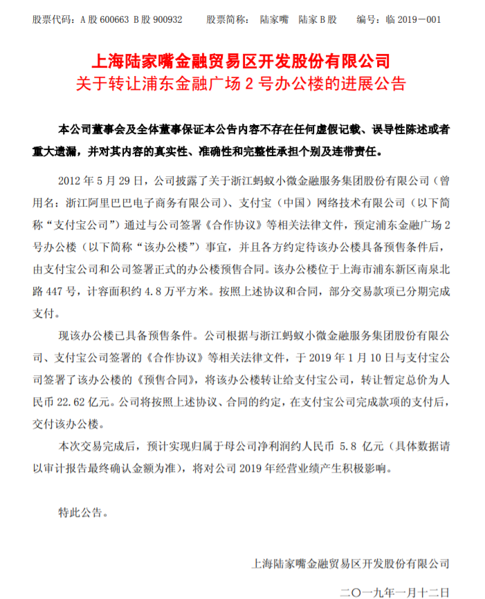 公告显示,2012年5月29日,陆家嘴即披露关于浙江蚂蚁小微金融服务集团股份有限公司、支付宝通过与公司签署《合作协议》等相关法律文件,预定浦东金融广场2号办公楼的事宜,并且各方约定待该办公楼具备预售条件后,由支付宝公司和公司签署正式的办公楼预售合同。