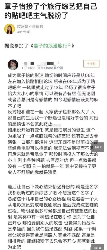 饭圈脱粉是家常便饭,但脱粉理由千千万,万万没想到章子怡竟因为新接了一个旅行综艺节目就把10年贴吧吧主老粉气到脱粉。