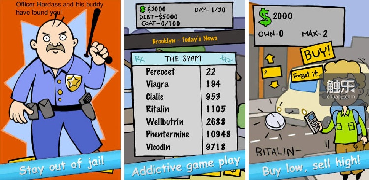 在苹果加强对于App Store的审核之后,关于Weed、Kush、Marijuana这一类的游戏或应用都变少了。但是某些开发商另辟蹊径:既然不允许出现软毒品,我卖药总行了吧?于是《药头战争》(Drug Wars!)就这么诞生了。