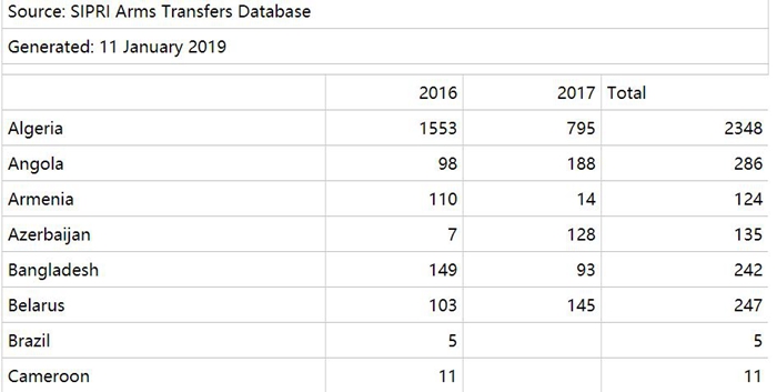 从2016年到2017年,俄罗斯收到了来自阿尔及利亚、安哥拉、马里、尼日利亚、南苏丹、苏丹、布基纳法索等多个非洲国家的武器购买订单,包括地对空导弹系统、战机、战斗和运输直升机等。