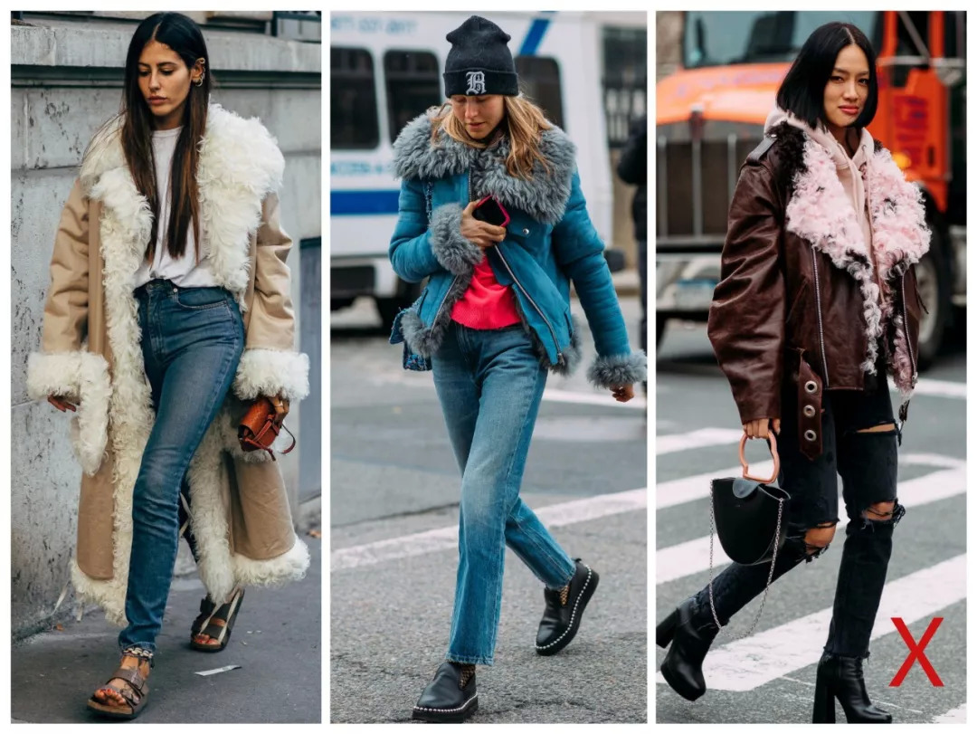 比如裤装,休闲随性的牛仔裤,街头感格纹裤,都能让皮草立马变时髦!钟小姐、Vanessa Hong都在这么穿。