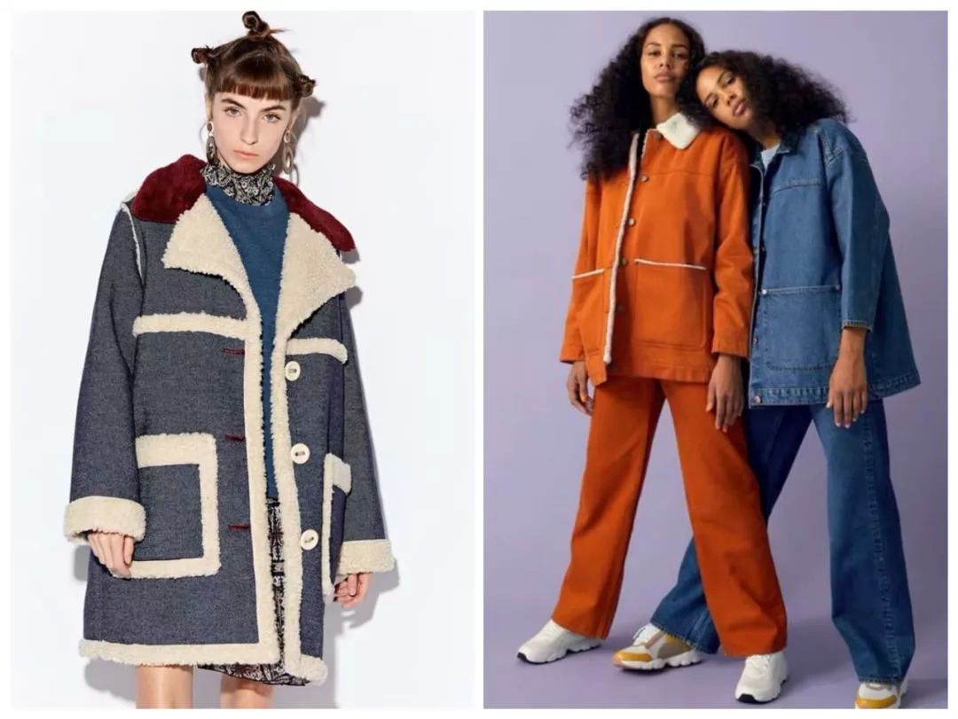 除此之外,彩色灯芯绒或牛仔羊羔毛夹克,则多了一点复古气质~MONKI这件,橘色拼白色毛毛,有种工装味道;