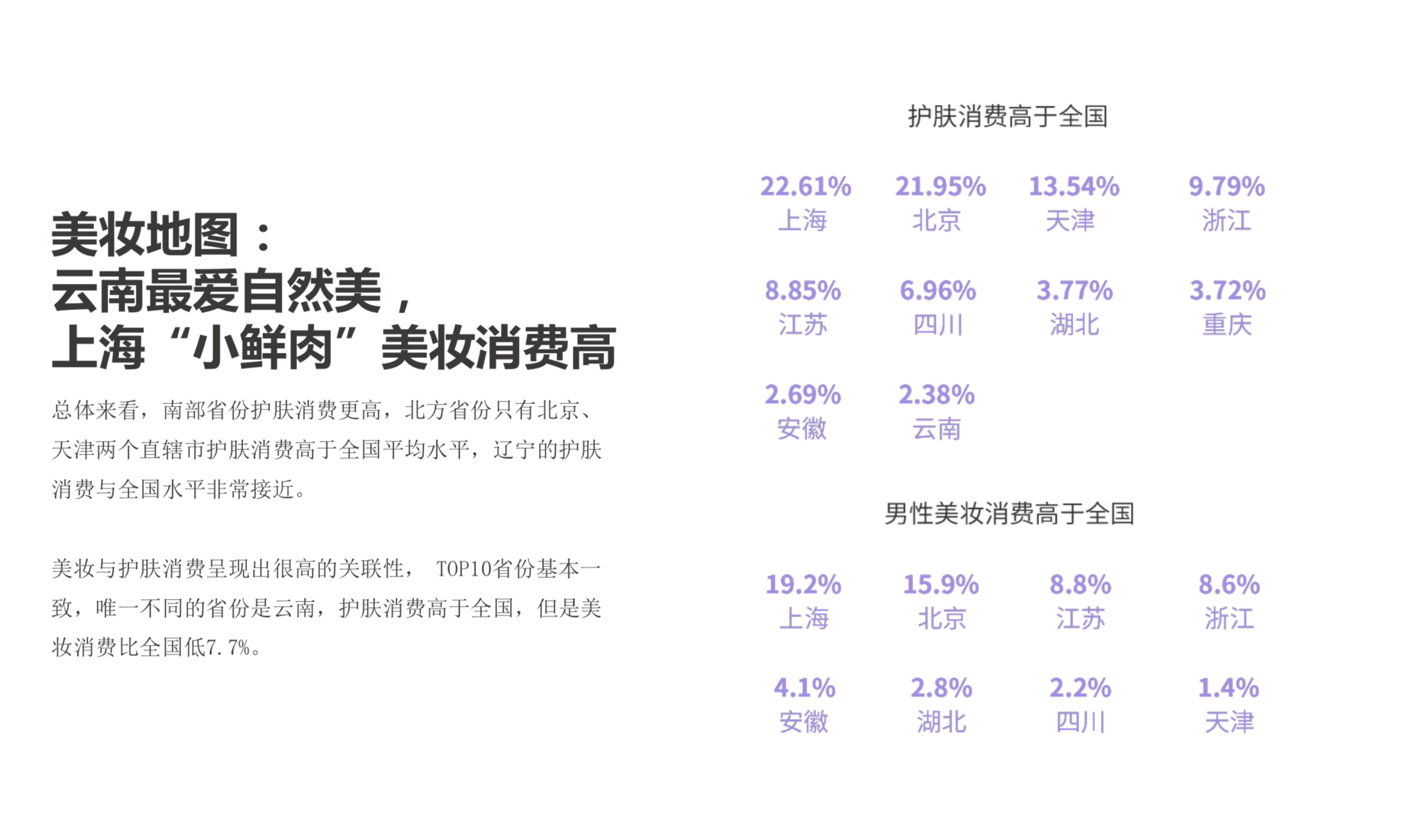 如果把消费者按年龄区分,会发现39至48岁的70后人群仍占是消费额度最高的群体,这主要是由于他们为中产阶级核心人群,偏爱高端品牌,因此客单价较高。儿29至38岁的80后群体居于第二位,并已形成了稳定的消费习惯,喜欢功效性护肤品,同时也是最偏爱线上消费的用户群。