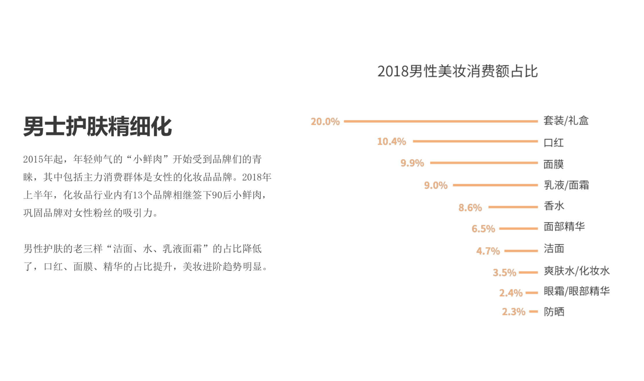 但这两年男性的美妆消费群体也越来越壮大,而且男性护肤老三样“洁面、水、乳液”的占比降低了,口红、面膜、精华的占比提升。 2017年起,男性在精华品类的消费额增幅和人均消费额开始超过女性,这与男性偏爱大牌、促销敏感度低的消费特点有关,同时也说明,男性护肤已不再停留于洁面、保湿的简单阶段,开始进入深度护肤的探索。