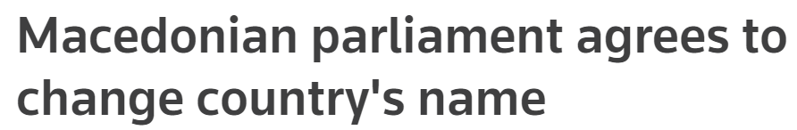 【马其顿议会同意更改国名】当地时间周五,马其顿议会通过修宪决议,将正式更改国名为北马其顿共和国,以此结束与希腊持续27年的争端。新国名将在希腊议会认可后投入使用。此前,希腊曾以否决马其顿的欧盟和北约成员国申请作为筹码要求马其顿更改国名。