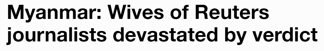 【在缅被捕记者上诉失败 因报道屠杀面临七年监禁】于2017年在缅甸被捕的两名路透社记者Wa Lone和Kyaw Soe Oo刚刚完成其上诉过程,宣判结果称上诉无效,两人依然将面临七年监禁。两名记者由于报道缅甸军方对若开邦罗兴亚难民的屠杀而被逮捕,罪名是非法持有机密文件。