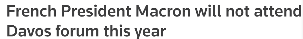 【马克龙将缺席达沃斯论坛】继特朗普宣布由于政府停摆和边境墙纠纷缺席达沃斯论坛后,法国总统马克龙也宣布将缺席达沃斯,原因是“黄背心”抗议相关的辩论日程和达沃斯论坛产生冲突。爱丽舍宫将于1月21日在凡尔赛举办商业领袖峰会。