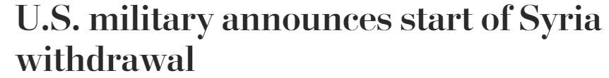 【美军宣布从叙撤军计划】周五,美军宣布正式开始从叙利亚撤军。据国防部官员称,初步撤军仅限于撤出武器和其他设备,人员编制还未开始撤离。特朗普曾多次在公开声明中称他要将驻叙美军“带回家”,但在前任国防部长马蒂斯辞职后,他显然放缓了步伐。国家安全顾问博尔顿还称,美军撤出叙利亚是有条件的:一是极端组织“伊斯兰国”(ISIS)被彻底击败,二是土耳其放弃对美军盟友库尔德武装的打击。土耳其总统埃尔多安公开拒绝了后一条件,因此此次撤军还存在极大不确定性。
