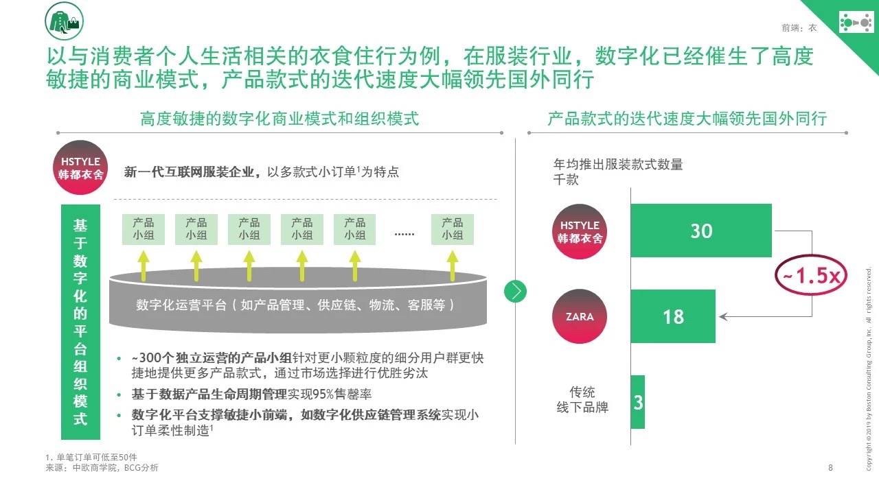 在服装行业,数字化已经催生出高度敏捷的商业模式,中国有一些高度数字化的新型服装企业,其产品款式的迭代速度已大幅领先国外同行。