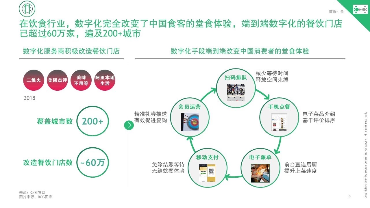 美团、饿了么等数字化服务商正积极改造餐饮门店。报告显示,目前中国端到端数字化的餐饮门店已超过60万家,遍及200多个城市。