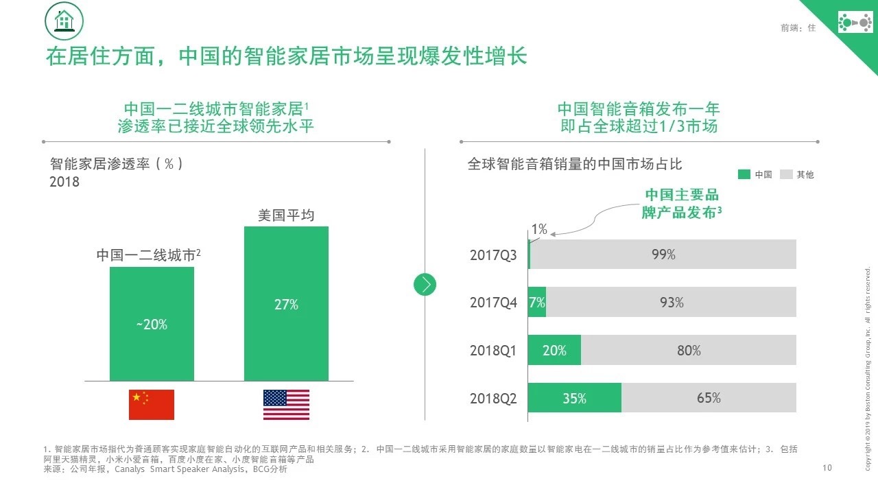 目前,中国一二线城市的智能家居渗透率已达到约20%,逼近全球智能家居最领先国家美国的27%。以智能音箱产品为例,在2017年第三季度,中国销量仅占全球市场的1%。但在2018第二季度末,中国的销量已经占到全球市场的1/3。