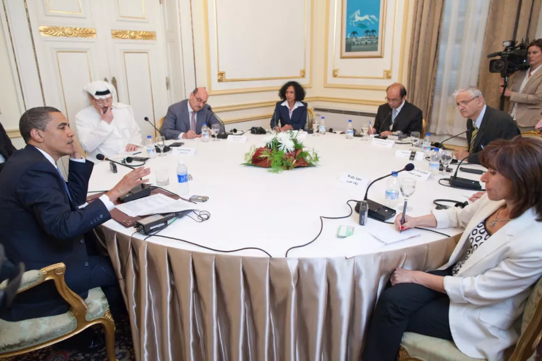 一名身着海湾传统服饰的记者坐在奥巴马左边,低头思索着什么。他的名字叫卡舒吉。