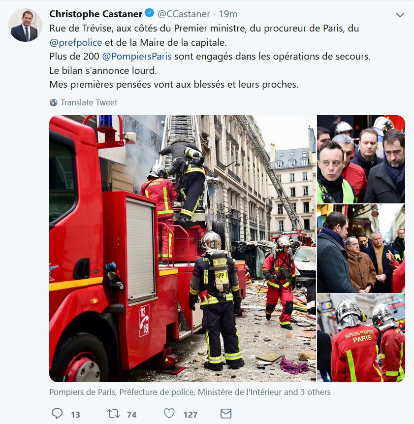 法国内政部长Christophe Castaner事发后在推特上发表声明称:“看上去将有严重伤亡”。但他在随后接受《巴黎人报》采访时表示,目前爆炸不会扩大,事发后半小时内已有200位消防部门的人赶到现场。