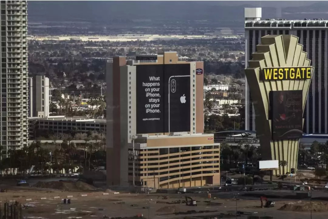 今年苹果在正对着拉斯维加斯会展中心一个酒店,拉起了巨幕广告: