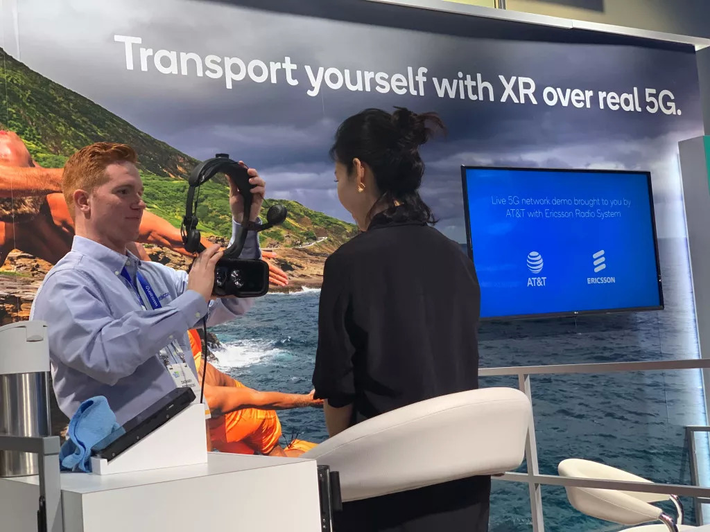 展区的天花板上架设着AT&T白色的5G信号发射盒,