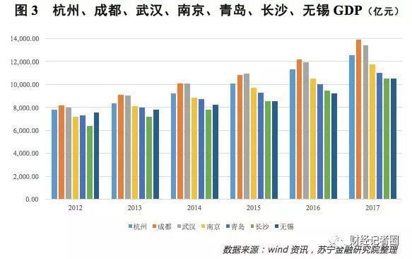 不难发现,二线城市正在飞速发展。数据显示,继天津、重庆、苏州后,2014-2017年,杭州、成都、武汉、南京、青岛、长沙、无锡七个城市经济总量也相继进入“万亿俱乐部”,且经济增速始终高于全国平均水平。